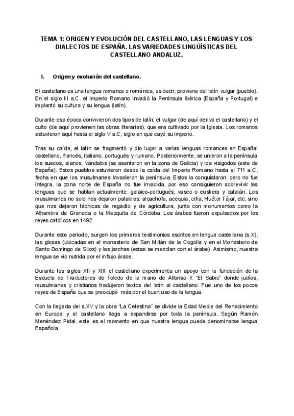 APUNTES TEMA 1- ORIGEN Y EVOLUCIÓN DEL CASTELLANO, LAS LENGUAS Y LOS DIALECTOS DE ESPAÑA. LAS VARIEDADES LINGÜÍSTICAS DEL CASTELLANO ANDALUZ