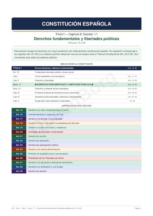 Resumen de los artículos 15 al 29 de la Constitución Española que contiene los Derechos fundamentales y libertades públicas del capítulo II del Título I