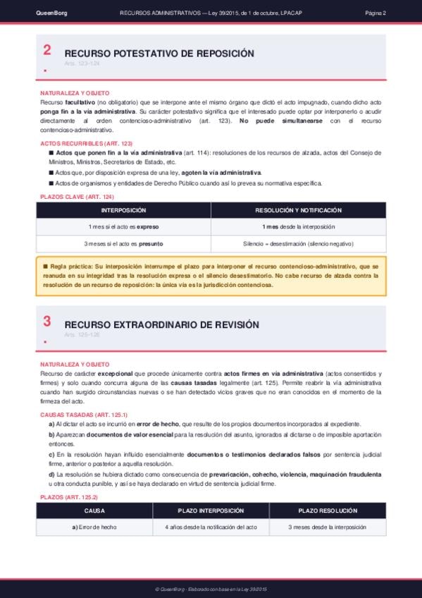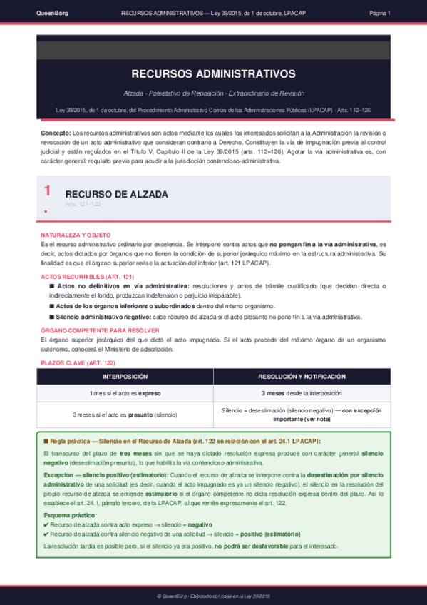 Resumen claro y esquemático de los recursos administrativos (alzada, reposición y extraordinario de revisión) conforme a la Ley 39/2015. Incluye tabla comparativa y puntos clave para examen.