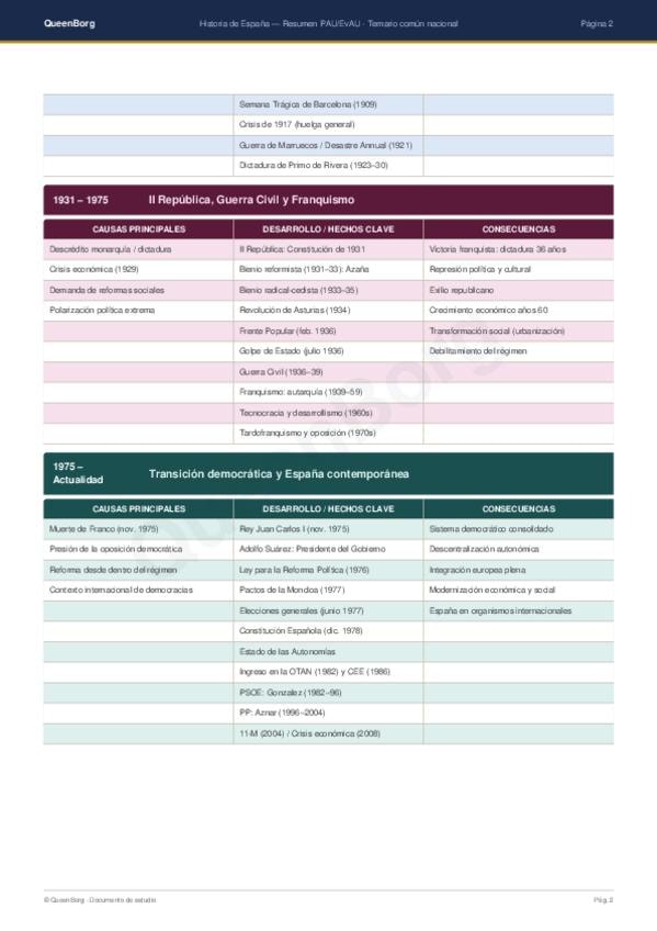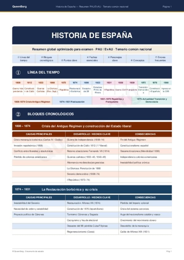 Resumen claro y esquemático de Historia de España para PAU/EBAU 2026. Incluye los principales periodos (1808-actualidad), fechas clave y conceptos esenciales para repasar de forma rápida y eficaz antes del examen.
