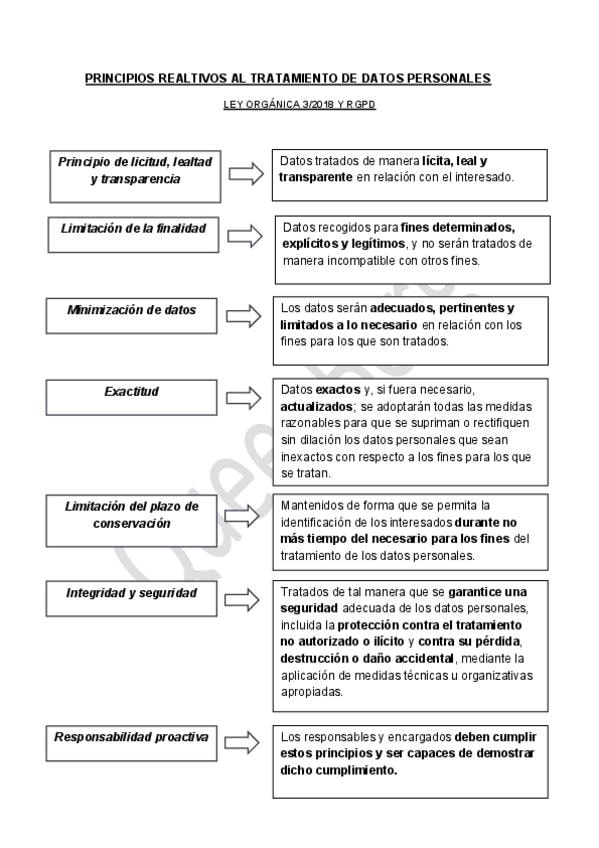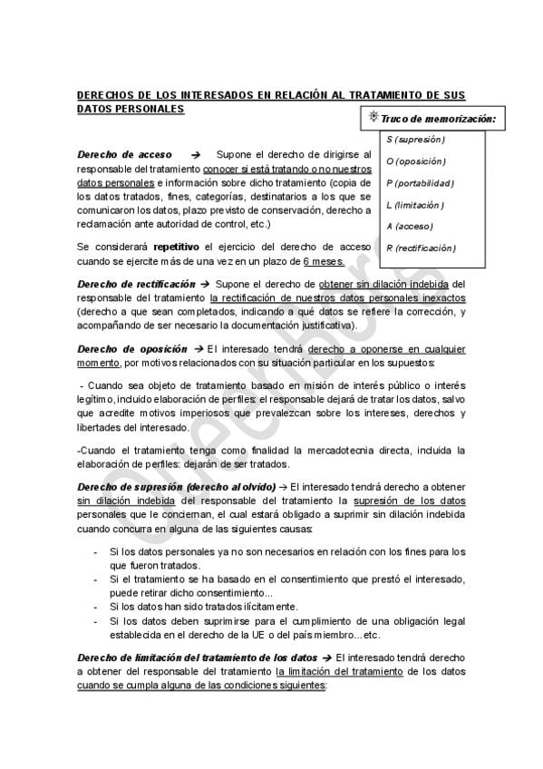 Resumen claro y esquemático de la LOPD y el RGPD: principios del tratamiento de datos, truco para memorizar los derechos, normativa sobre menores, figura del Delegado de protección de datos y funciones de la AEPD. Ideal para repaso rápido.