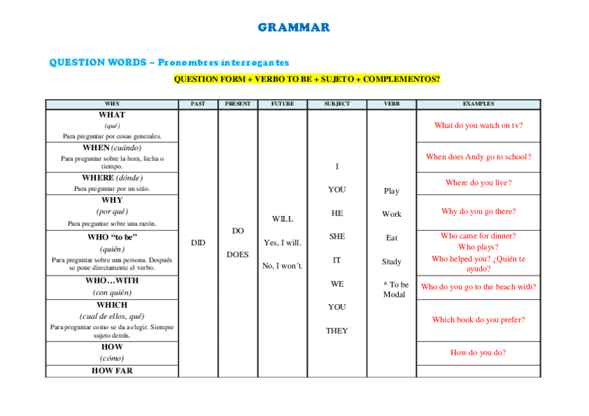 Esta gramática ha sido elaborada por mí a partir del libro y las aclaraciones de la profesora. Espero os sirva. Viene todo explicado, como se forman los pretéritos, question tags, questions forms, comparative and superlative, modals verbs, reported speech