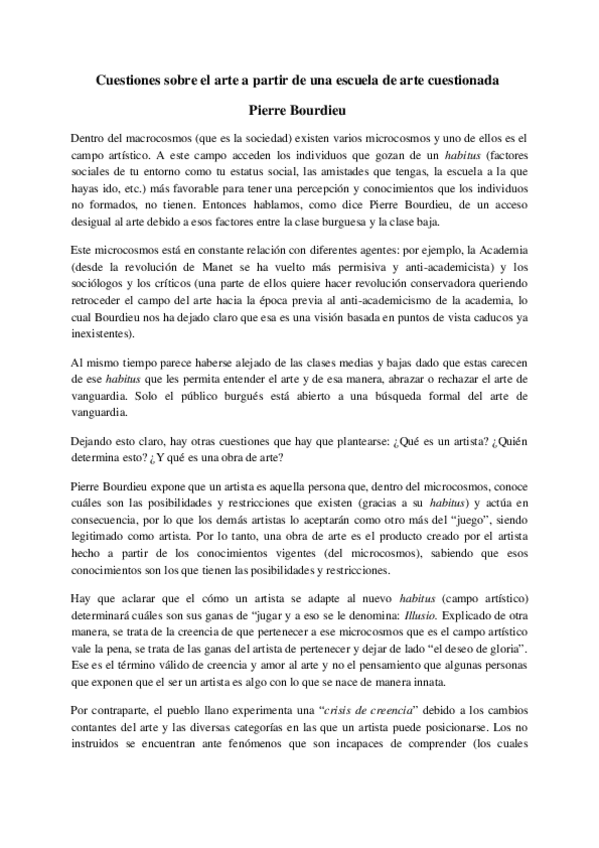 Resumen del texto: "cuestiones sobre arte a partir de una escuela de arte cuestionada" de Pierre Bourdie. Tema 1.