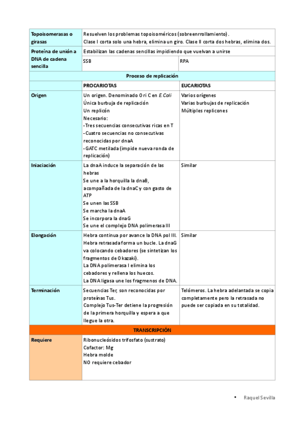 Tabla comparativa de replicación, transcripción y traducción de procariotas y eucariotas.