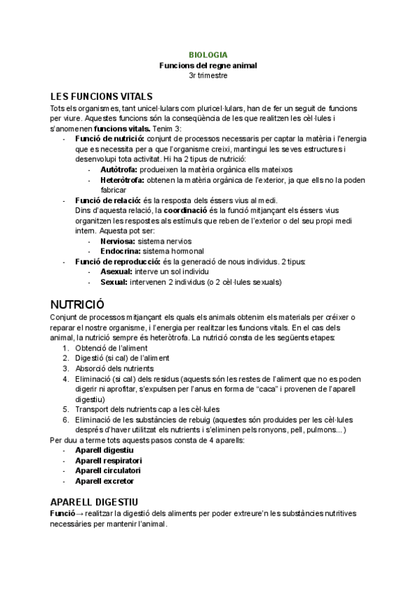 Explicació completa de les funcions de nutrició, relació i reproducció de tot el regne animal. Tot el temari necessari per batxillerat.
