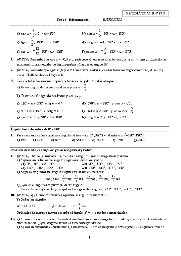 Gran variedad de ejercicios de trigonometría para gente de 4 ESO, también pueden ser un repaso para gente de 1 Bachillerato