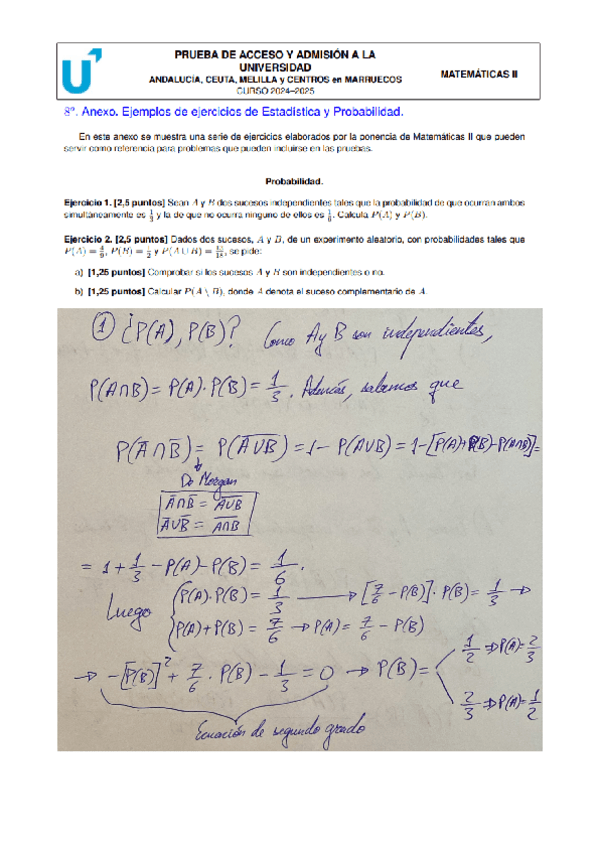 Ejercicios de examen resueltos de Probabilidad y Estadistica (Examen Oficial de Prueba para EBAU 2024/2025)