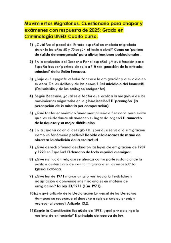 Movimientos Migratorios. Cuestionario para chapar y exámenes con respuesta de 2025: Grado en Criminología UNED-Cuarto curso.