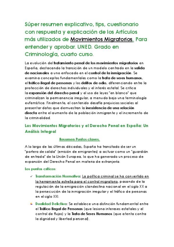Súper resumen explicativo, tips, cuestionario con respuestas y explicación de los Artículos más utilizados de Movimientos Migratorios. Para entender y aprobar. UNED. Grado en Criminología, cuarto curso.