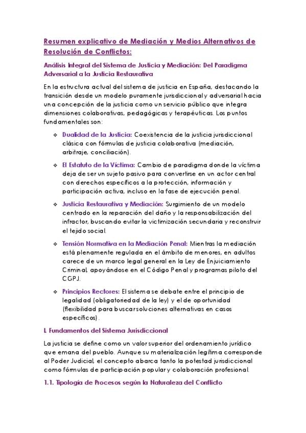 Resumen Explicativo. Mediación y medios alternativos de resolución de conflictos. Grado en Criminología, UNED. Tercer curso.