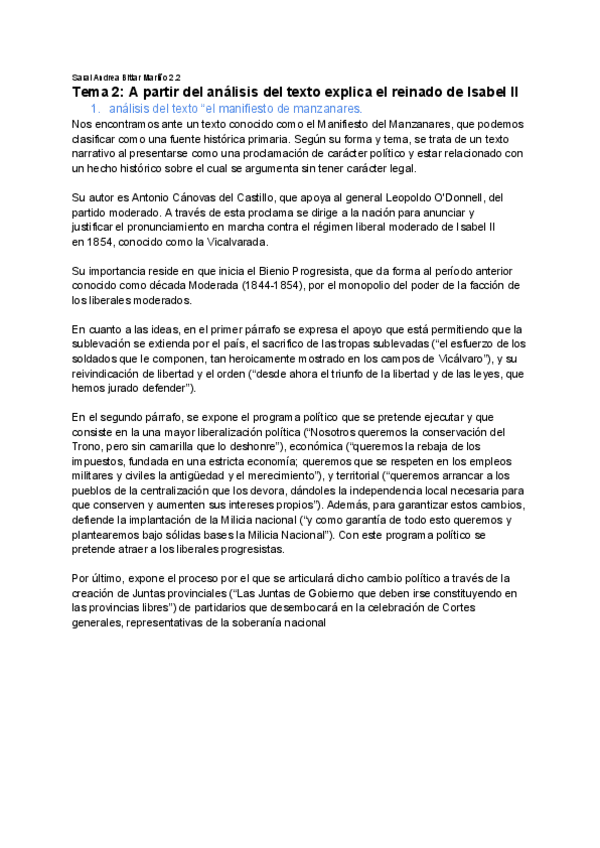 Estándar sobre el estado liberal de Isabel II y el comentario del texto del Manifiesto de Manzanares