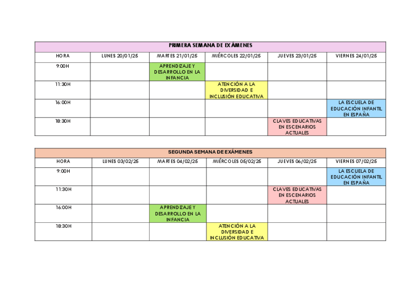 CUADRO SEMANA DE EXAMENES 1 CUATRI 1 DE INFANTIL