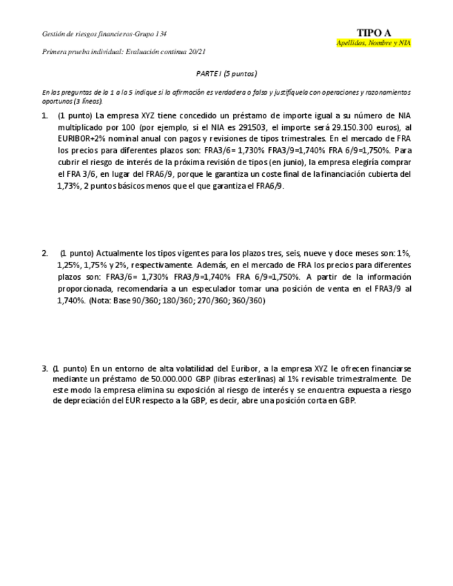 He publicado nuevos apuntes de 3º Gestión de riesgos financieros: Examen parcial
