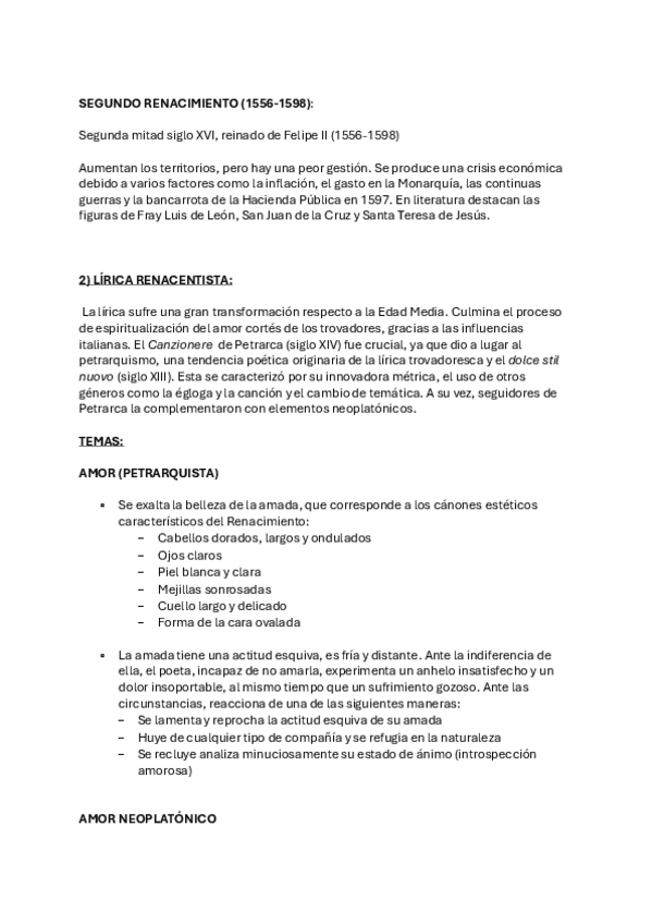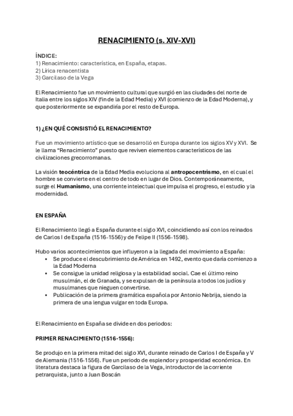 Incluye: Renacimiento: característica, en España, etapas. 2) Lírica renacentista 3) Garcilaso de la Vega