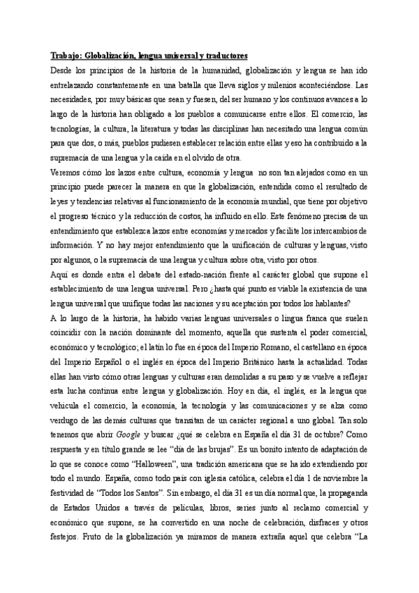 Segundo trabajo donde se habla de la lengua, la globalización y la función del traductor en todo el proceso y su papel.
