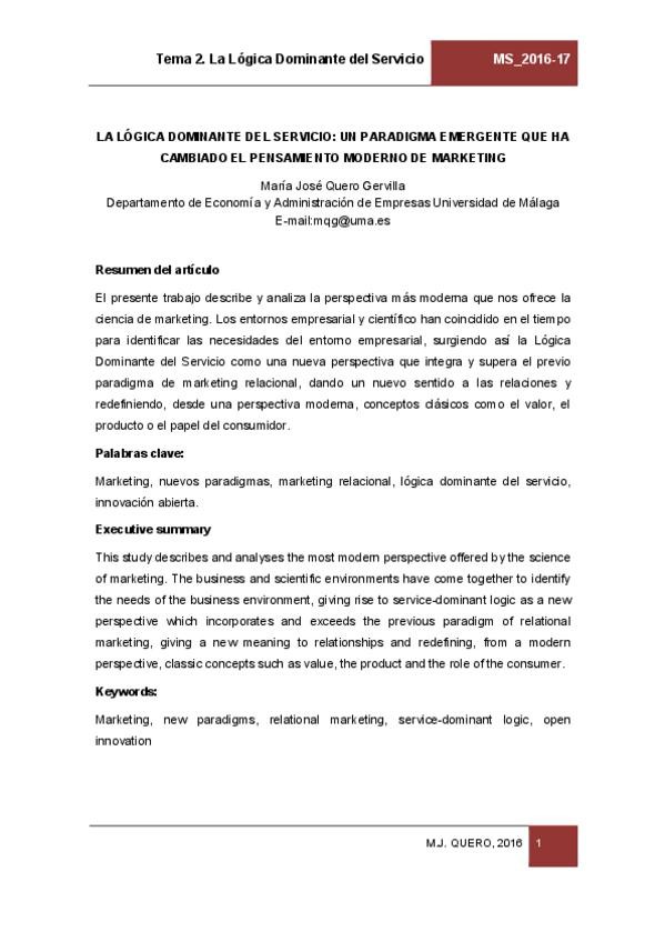 Temario de la asignatura de Marketing de servicios de la profesora María José Quero Guervilla.