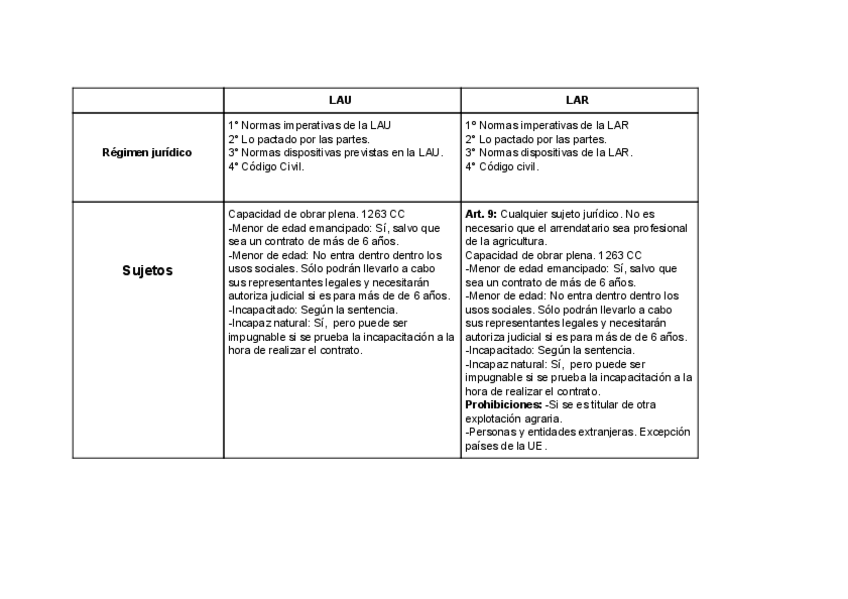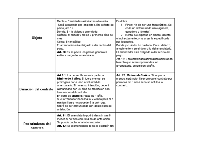 Tabla comparativa de los contratos de arrendamientos urbanos y rústicos con la legislación correspondiente. A recomendación de la profesora para su mejor estudio y la posibilidad de que sea preguntado de esta manera en el examen.