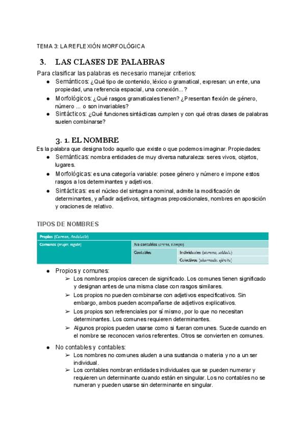 Documento teórico de lengua sobre la reflexión morfológica. Explica las clases de palabras (nombre, adjetivo, determinantes, pronombres, verbo, adverbio, preposiciones, conjunciones e interjecciones) según criterios semánticos, morfológicos y sintácticos.