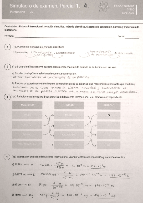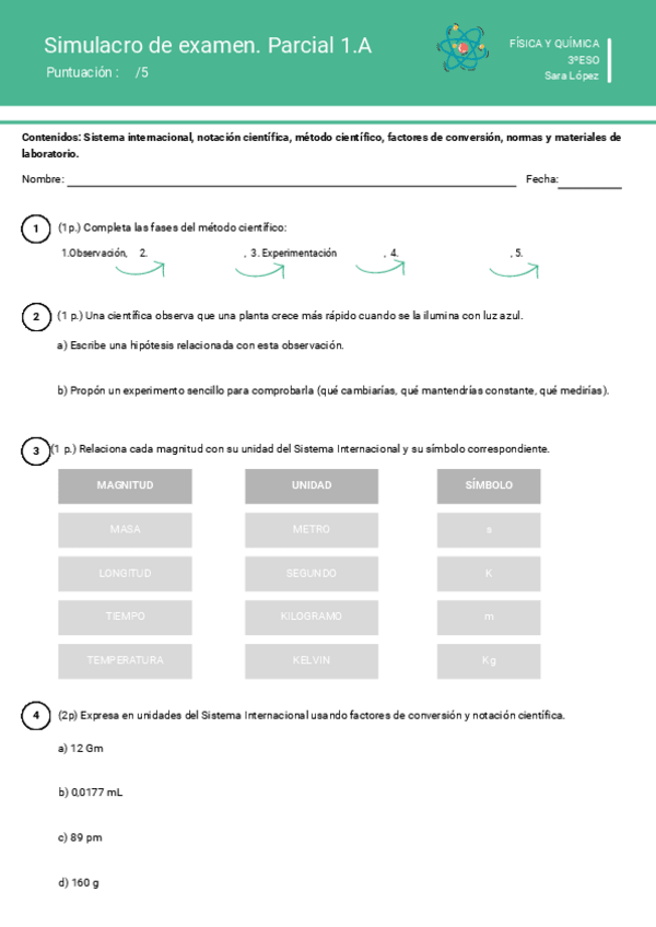 Contenidos de física y química de la ESO. En este caso un par de pruebas cortas sobre los primeros temas de química (factores de conversión, método científico, sistema internacional...)