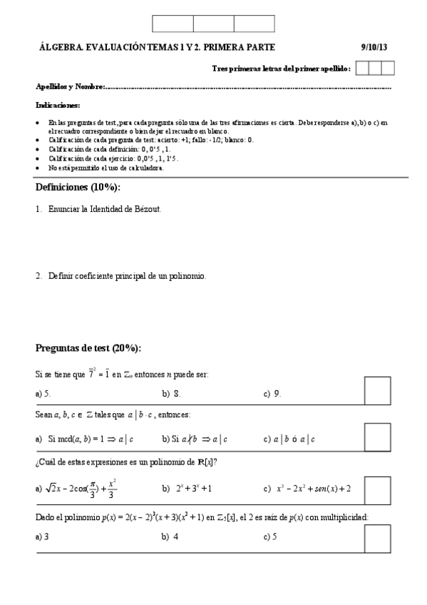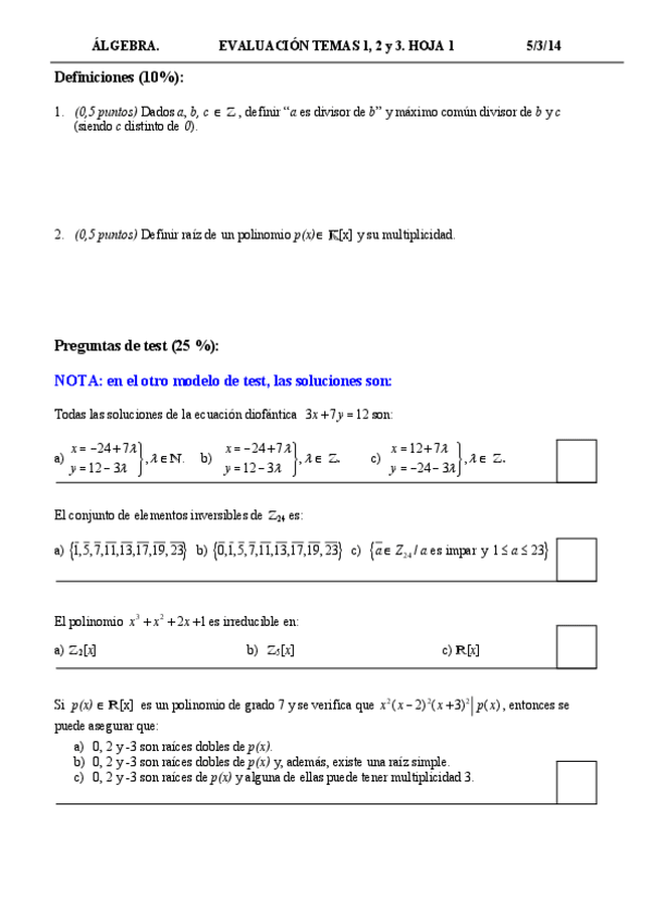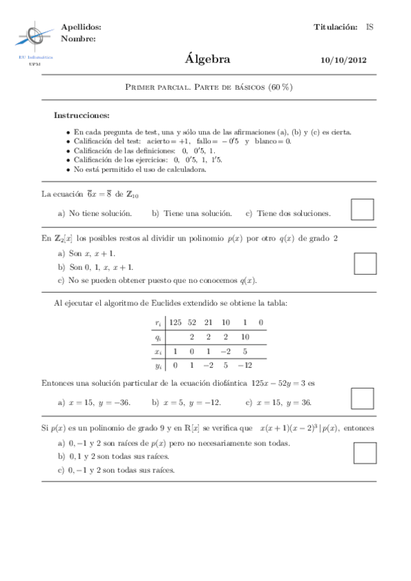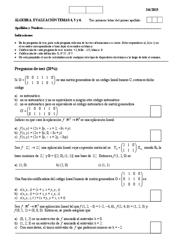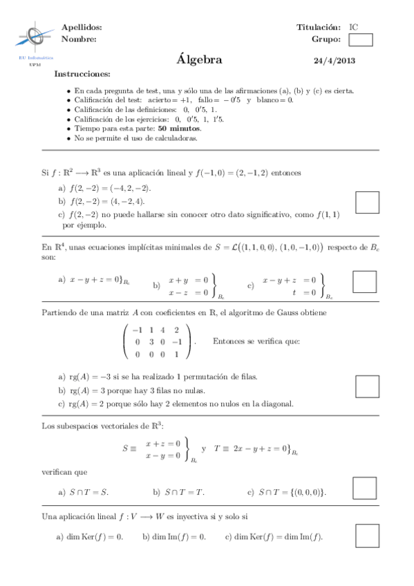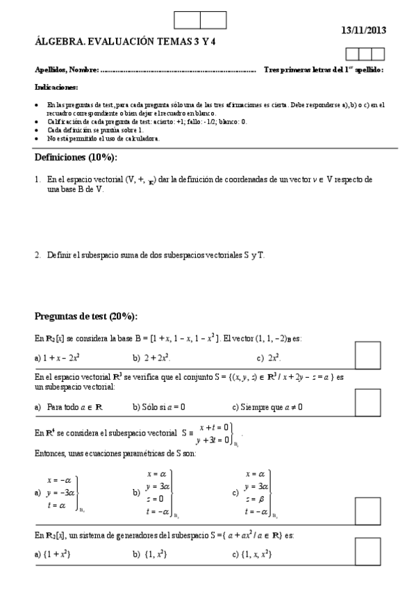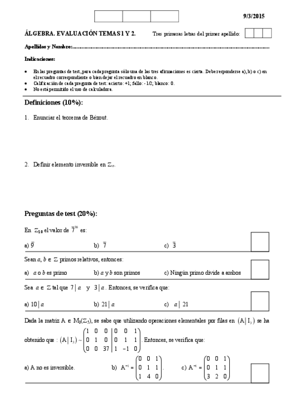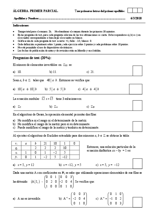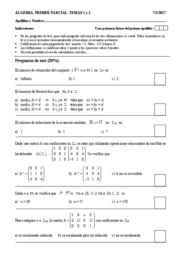 He publicado nuevos examenes de 1º Álgebra: primeros parciales en blanco