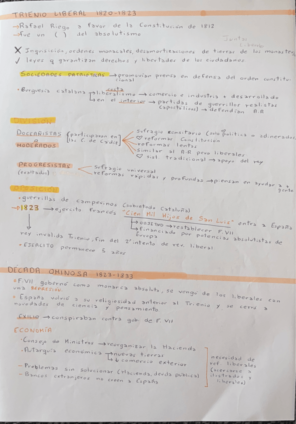 Apuntes de la restauración del absolutismo, con los pronunciamientos militares y crisis de la época. También se trata el trienio liberal y la década ominosa. Además de la cuestión sucesora con una línea temporal