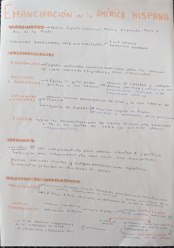 Apuntes de la emancipación de la América hispana, con sus respectivos factores, causas, consecuencias, ideología y la división de las dos etapas.