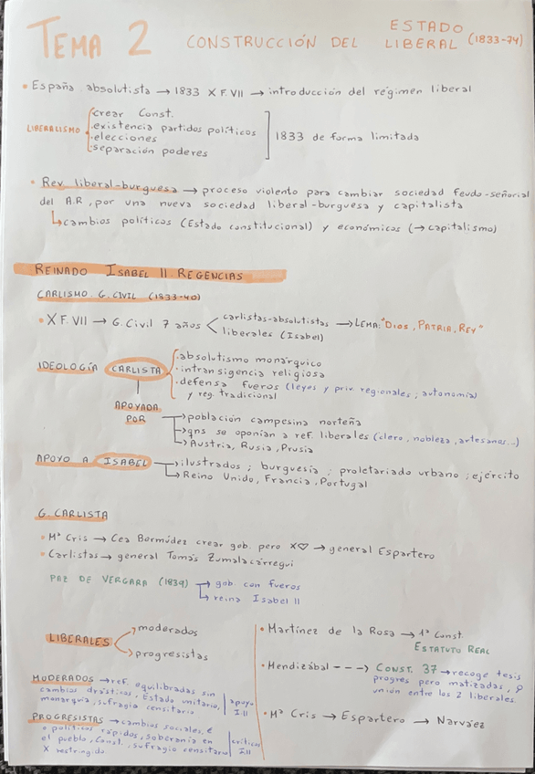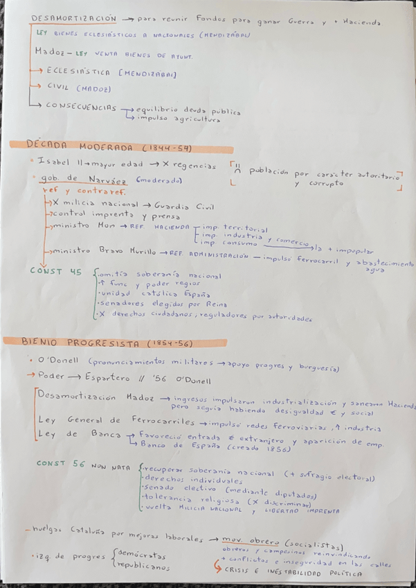 Apuntes de la construcción del Estado liberal y el reinado de Isabel II, además de la Guerra carlista, la división entre moderados y progresistas, la Década Moderada, la desamortización y el Bienio Progresista. Al final os he dejado conceptos PAU 2025 ?