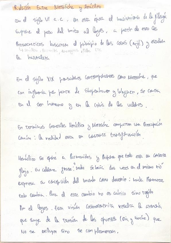Relación entre autores para la PAU entre Nietzche y Heraclito, corregida por una profesora de filosofía. Esta muy bien Heraclito es el mejor autor con el que relacionar a Nietzche.