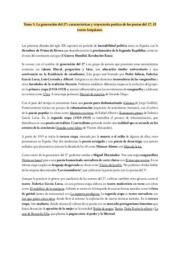La generación del 27: características y trayectoria poética de los poetas del 27. El teatro lorquiano.