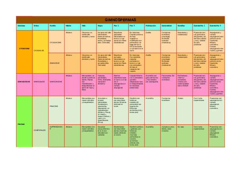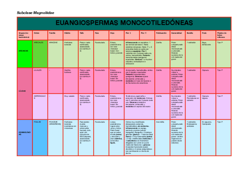 Cuadros resúmenes con la organografía de las principales familias vistas en teoría con Víctor