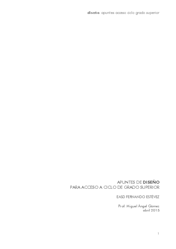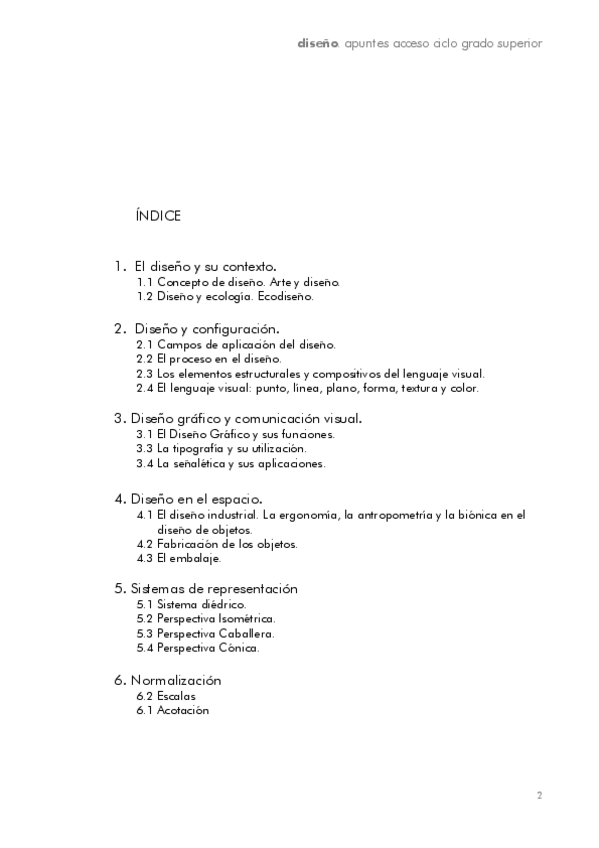 1. El diseño y su contexto. 2. Diseño y configuración 3. Diseño gráfico y comunicación visual. 4. Diseño en el espacio. 5. Sistemas de representación 6. Normalización