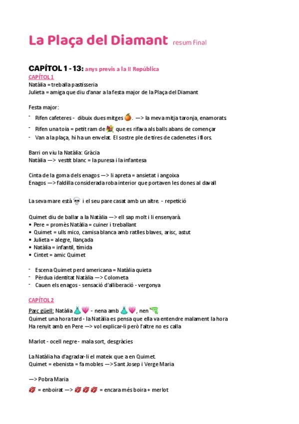 Resum llibre la Plaça del Diamant + apunts significats metàfores