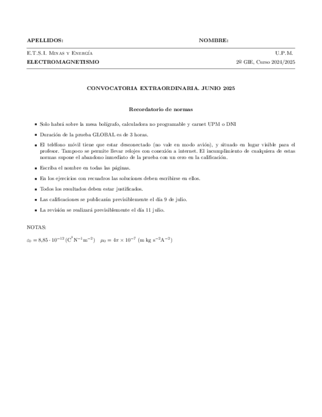 He publicado nuevos examenes de 2º Electromagnetismo: Examen Junio 2025