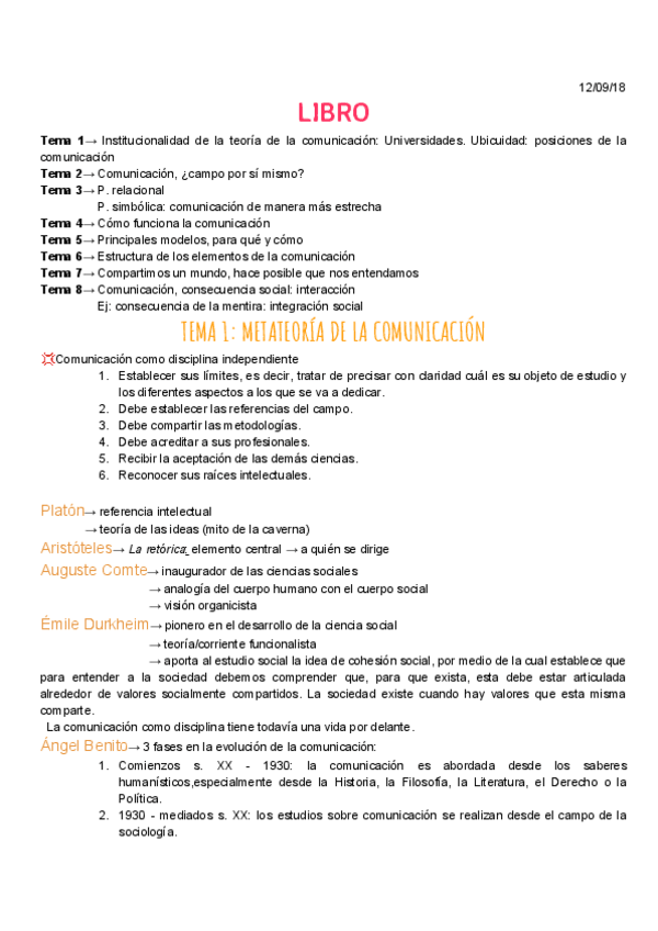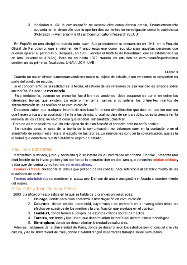 Temario de clase de Teorías de la comunicación. Tema 1 (Metateoría de la comunicación), tema 2 (La escuela de Chicago).