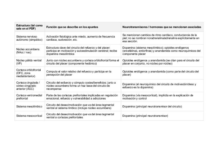 Estructuras implicadas en todos los procesos del temario, con sus funciones y los neurotransmisores/hormonas asociadas a cada estructura