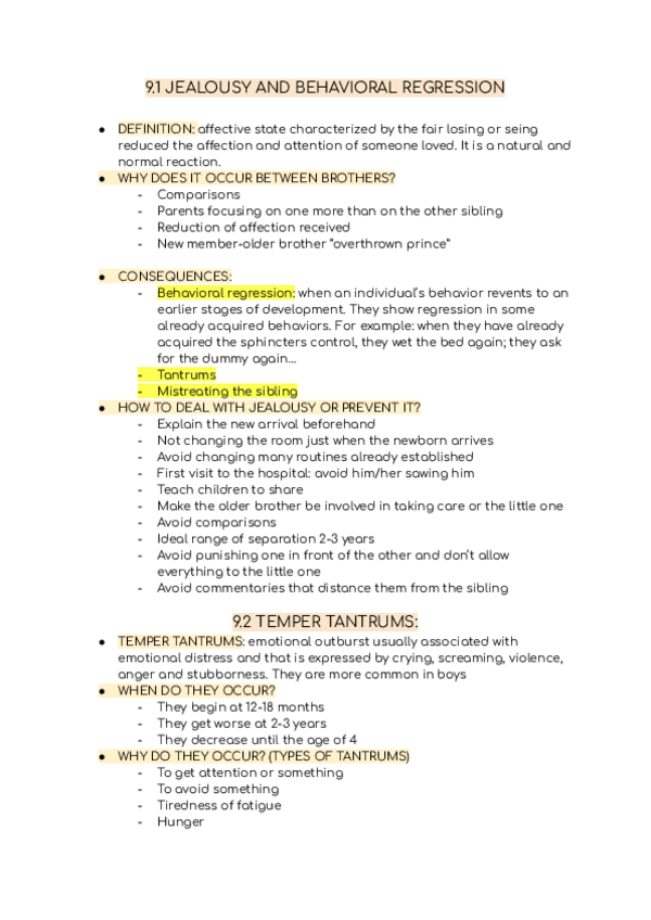 Apuntes en ingles para examen tema 9: JEALOUSY AND BEHAVIORAL REGRESSION