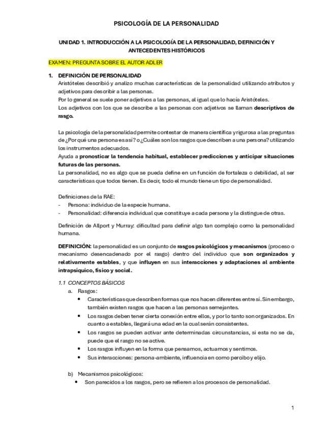 Apuntes de personalidad con ejemplos de preguntas de examen que la profesora va mencionando a lo largo de la explicación de clase