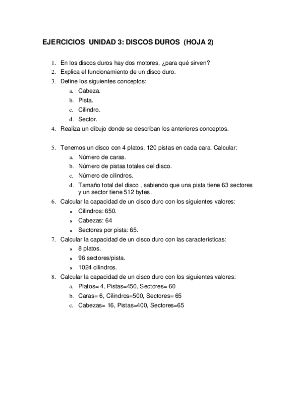 Preguntas y cálculos sobre el funcionamiento, componentes y capacidad de almacenamiento de discos duros. Se incluyen ejercicios para definir conceptos clave, realizar dibujos explicativos y calcular el tamaño total del disco