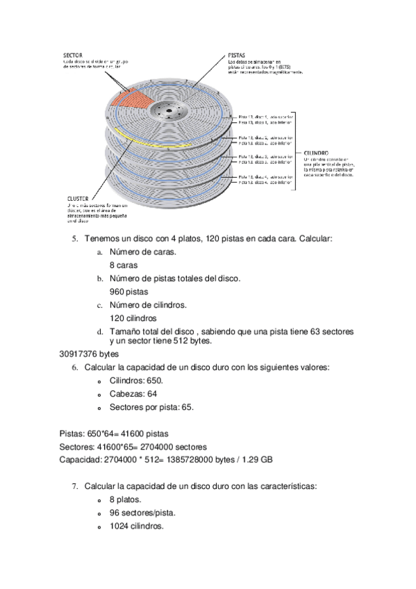 Preguntas y cálculos sobre el funcionamiento, componentes y capacidad de almacenamiento de discos duros. Se incluyen ejercicios para definir conceptos clave, realizar dibujos explicativos y calculos resuelto