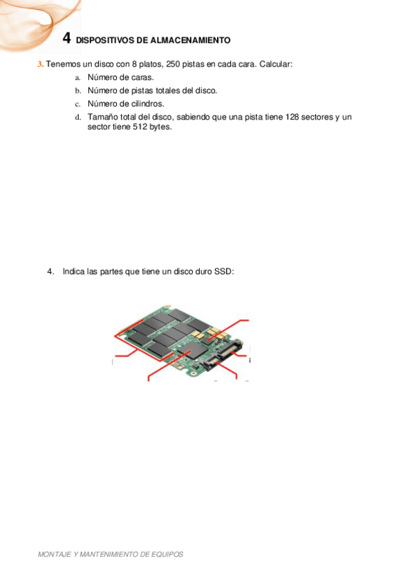 Ejercicios y cálculos relacionados con discos duros y SSD. Incluye identificación de componentes, conceptos clave como pistas y sectores, cálculo de capacidad y análisis de particiones en sistemas operativos Linux y Windows.