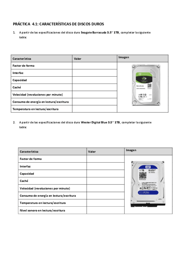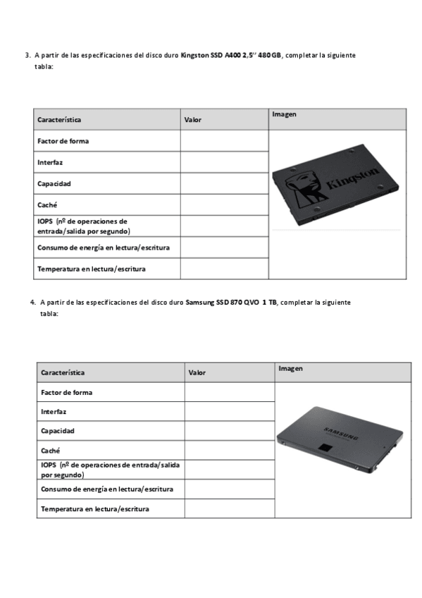 Ejercicios para completar tablas con especificaciones técnicas de distintos modelos de discos duros HDD y SSD, incluyendo capacidad, velocidad, consumo energético y temperatura de funcionamiento.