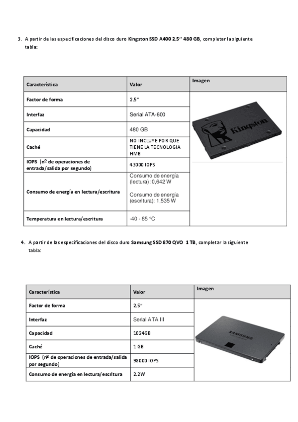 Ejercicios para completar tablas con especificaciones técnicas de distintos modelos de discos duros HDD y SSD, incluyendo capacidad, velocidad, consumo energético y temperatura de funcionamiento resuelto
