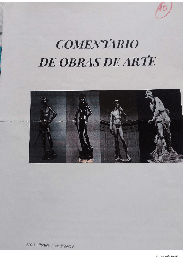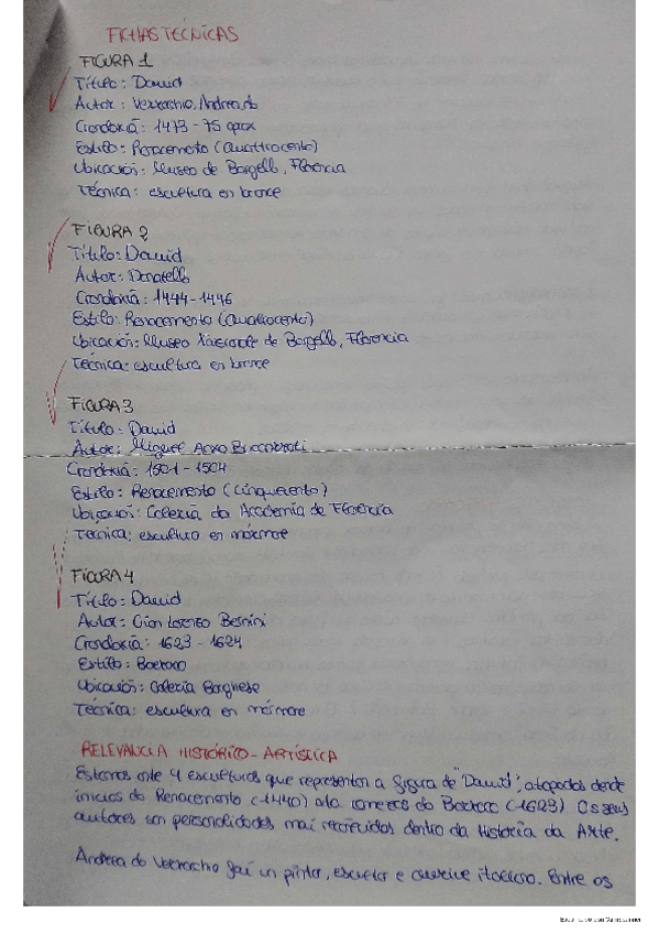En este documento se aportan las fichas técnicas,el contexto histórico,análisis iconográfico,formal y conclusión sobre los 4 David's de la Historia(Donatello,Miguel Ángel,Verrochio y Bernini).Esta corregido por un profesor especializado en la materia.