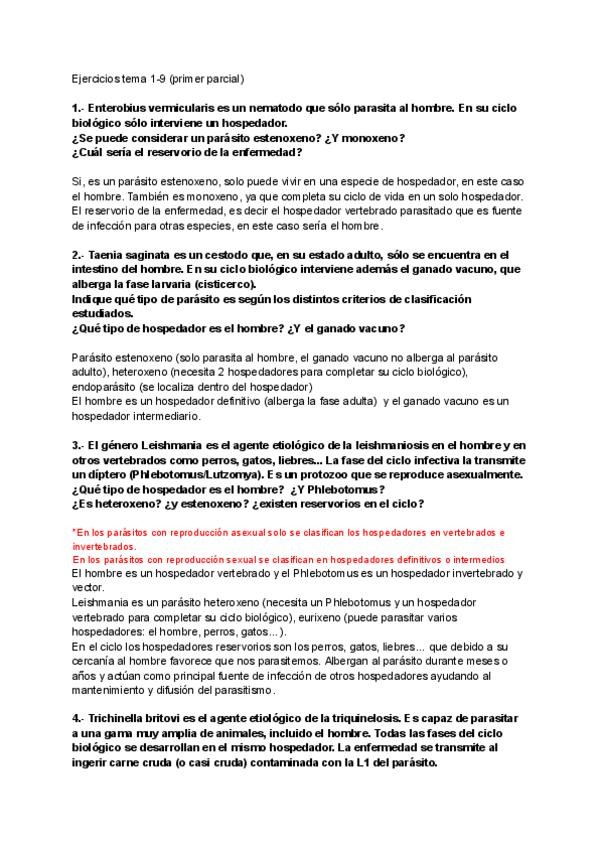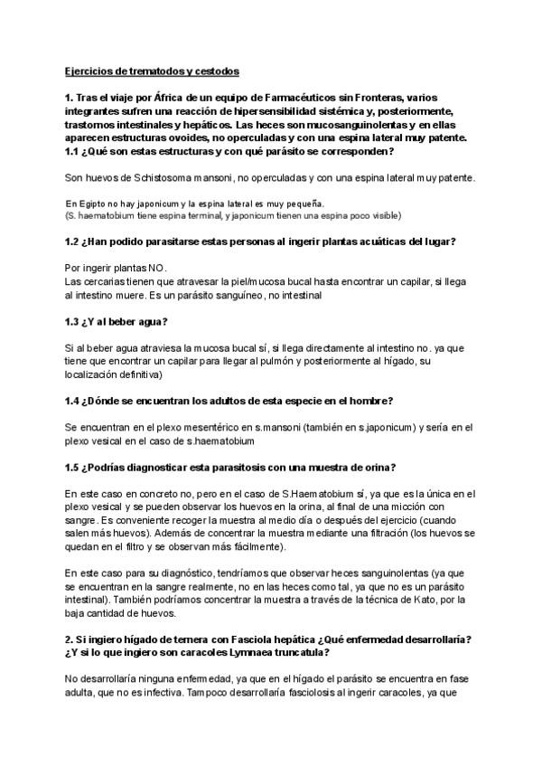 Ejercicios casos clínicos segundo parcial: trematodos, cestodos, nematodos y artrópodos (ejercicios tipo examen)