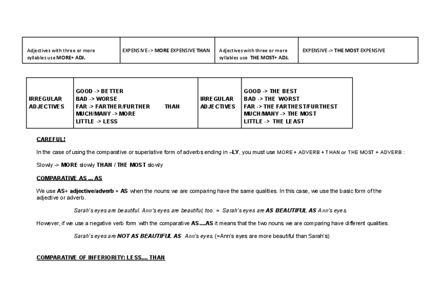 Aquest document explica de manera clara i senzilla com s’utilitzen els comparatives i els superlatives en anglès. S’hi detalla quan i com s’afegeixen terminacions com “-er” i “-est” als adjectius, així com quan s’utilitzen “more” i “most” davant d’adjecti