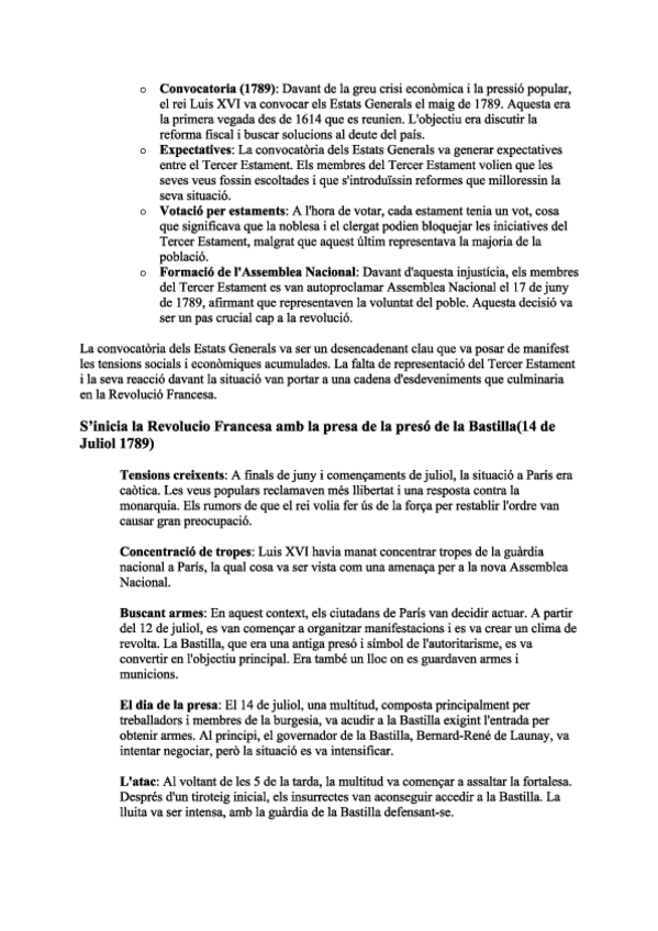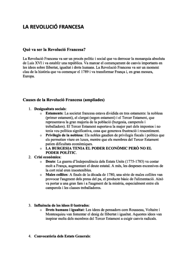 Aquest document recull un resum clar i complet sobre la Revolució Francesa (1789-1799), un dels esdeveniments més importants de la història moderna. És un material molt útil per preparar exàmens d’Història, fer repàs ràpid de conceptes clau i comprendre