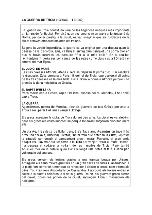 Aquest document ofereix un resum complet i fàcil d’entendre sobre la Guerra de Troia, un dels episodis més famosos de la mitologia grega. És un material molt útil per entendre la mitologia grega, preparar exàmens de literatura o història antiga, i tenir