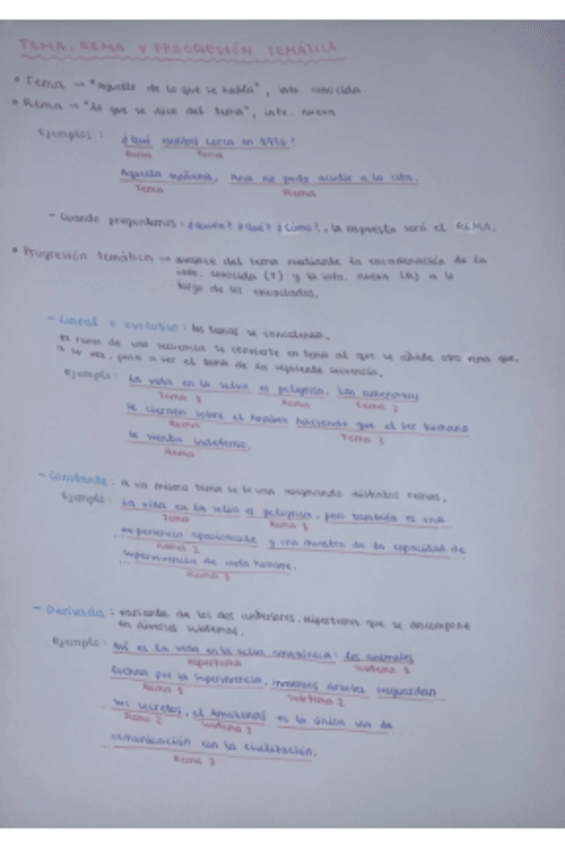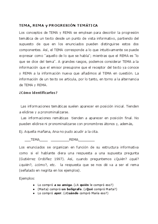 Este documento explica de forma clara y esquemática los conceptos de tema, rema y progresión temática, fundamentales para entender cómo se organiza la información dentro de un texto. El material es muy útil para asignaturas de lengua y comunicación, ya q