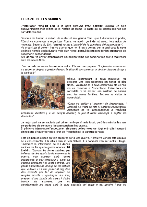 Aquest document presenta un resum clar i complet sobre el mite del Rapte de les Sabines, un episodi llegendari de la mitologia romana que explica els orígens de Roma i el paper de les dones en la consolidació de la ciutat. El document és útil per assigna