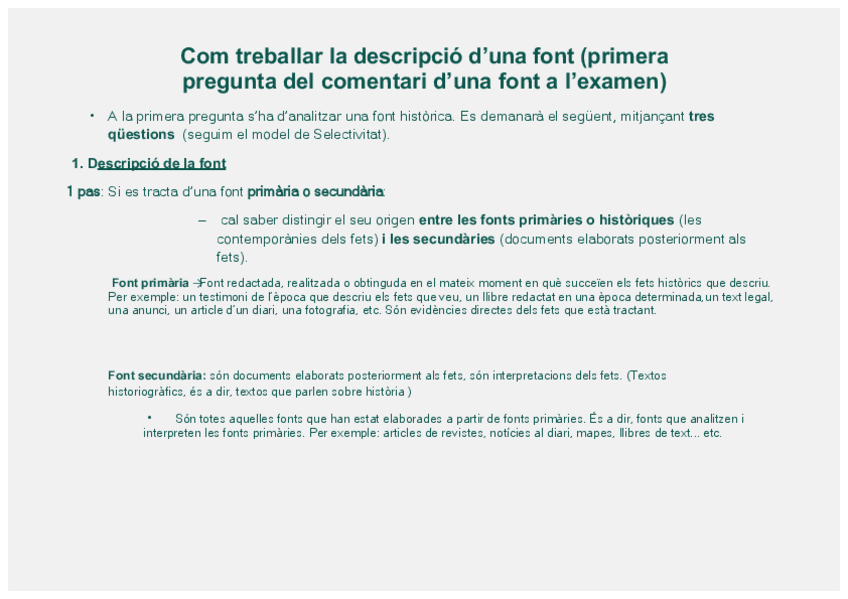 Aquest document explica com analitzar correctament una font històrica, un procediment fonamental per comprendre i interpretar el passat. S’hi descriuen els passos principals de l’anàlisi històrica, tant per a fonts escrites com materials, gràfiques o audi